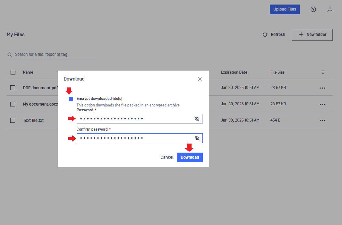 • Password protection is enabled: In this case, an option will be displayed to enable password protection (encryption) for your downloaded file(s).