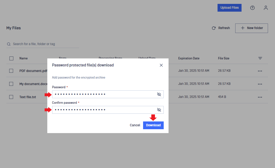 • Password protection is enforced: In this case, a window will be displayed where you have to enter a password to protect (encrypt) your downloaded files.