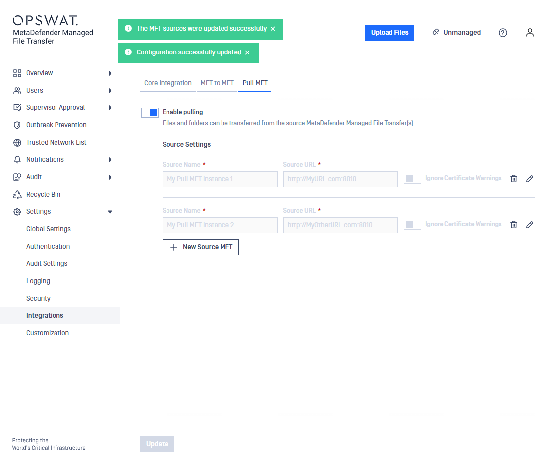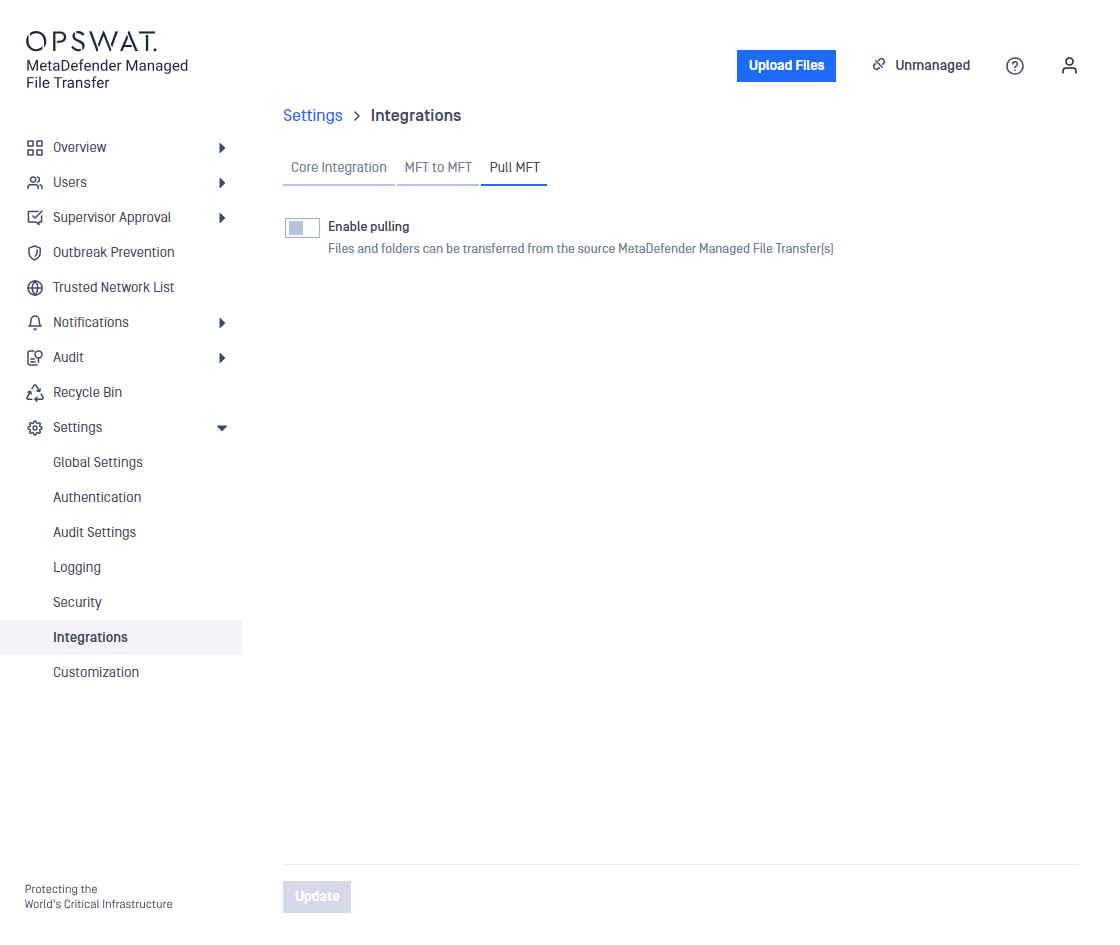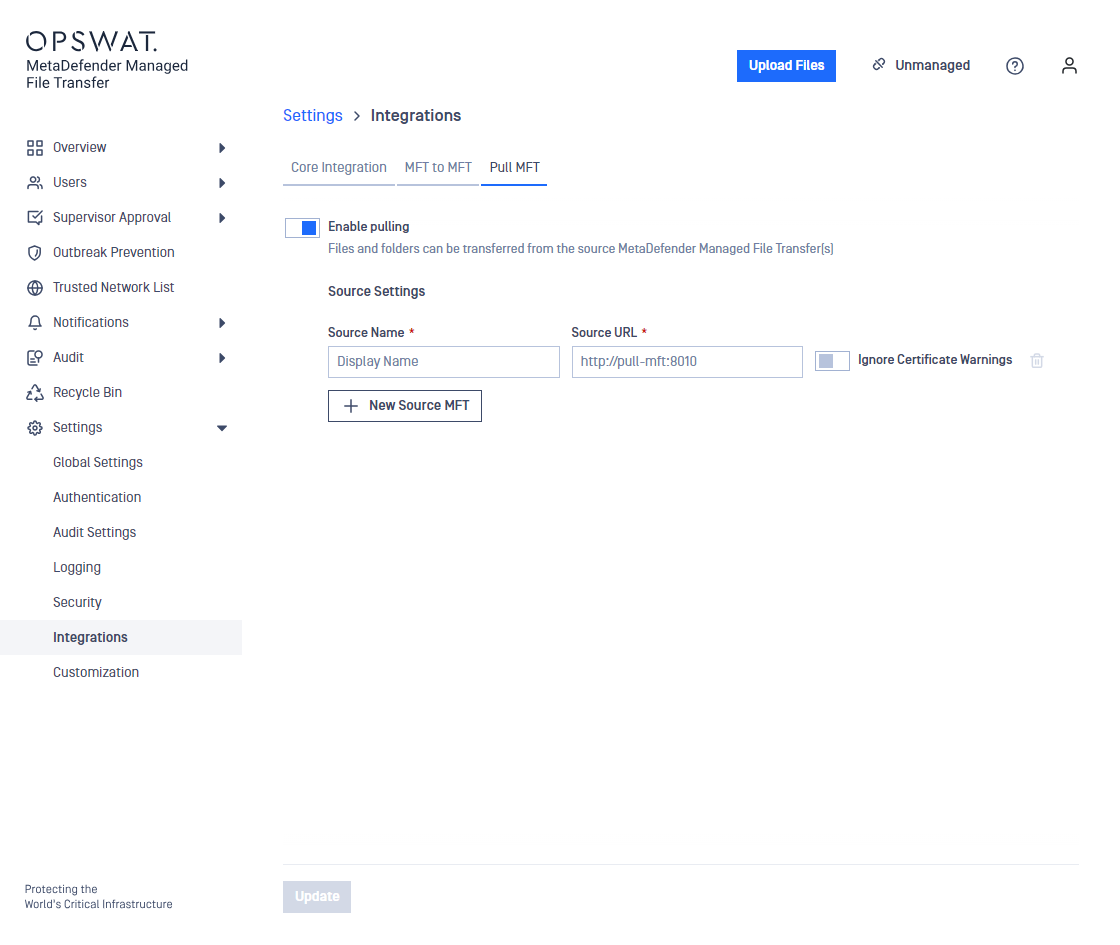 Pull MFT allows you to transfer files from another MetaDefender MFT directly into your current logged in account. First you need to enable this feature from the settings menu, then setup the MetaDefender MFT instances you wish to Pull files from. Once these settings are configure through the upload menu you can select pull, login to an account and browse the files you wish to acquire.