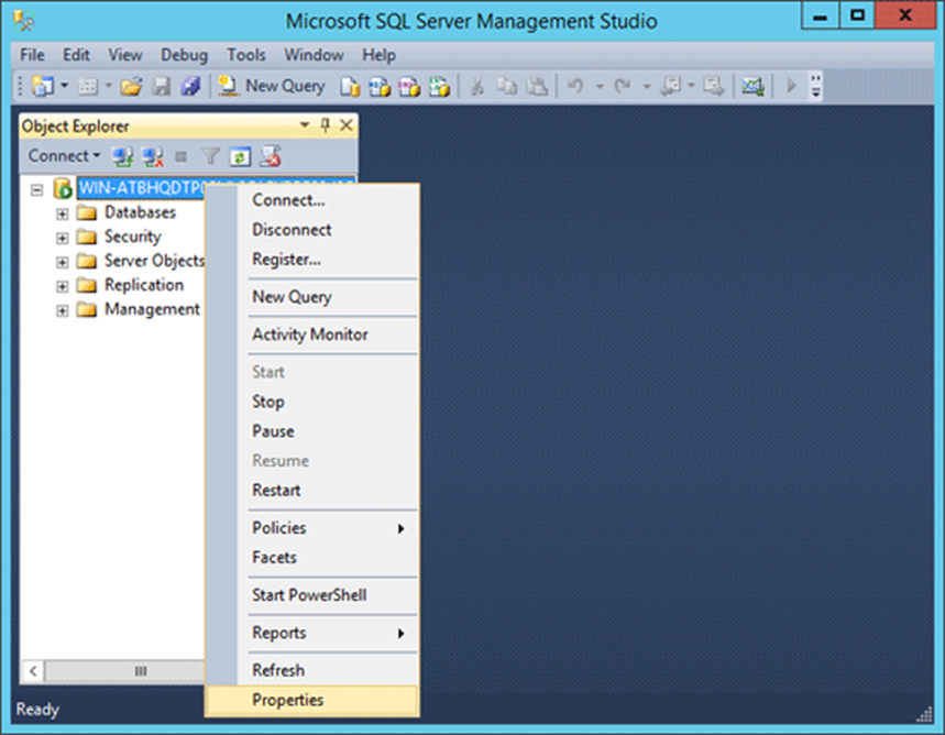 NOTE: By default, SQL Express comes with only Windows authentication enabled. To also be able to create and use SQL accounts, this needs to be manually enabled. To do this, from SQL Server Management Studio right-click on the SQL Express instance, and go to Properties: