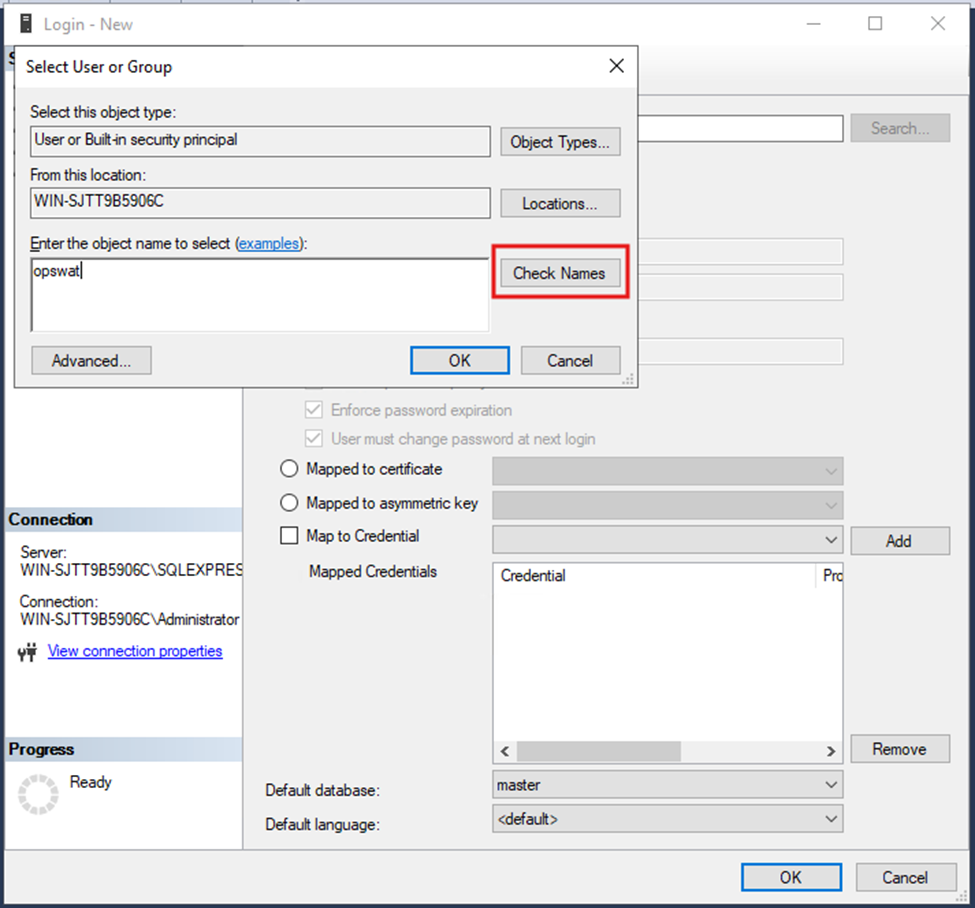 For Windows Authentication, select the corresponding option then click Search to select one of the local or Active Directory accounts present on the system as in the following example, making sure to click on Check Names to confirm the user account is valid: