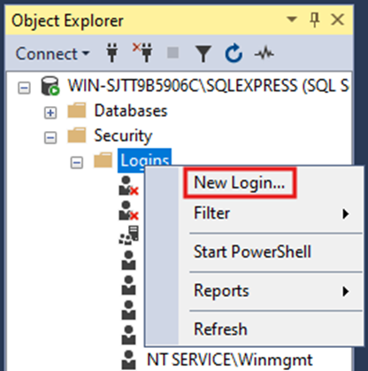 After the MFT installation is complete, you may wish to restrict access only to the MFT databases. For this purpose, new accounts can be created using SQL Server Management Studio, by navigating to Security -> Logins then right-clicking on Logins and clicking on New Login:
