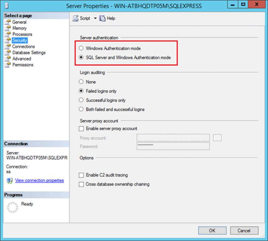 Then go to the Security page on the left side menu and under Server authentication enable SQL Server and Windows Authentication mode: