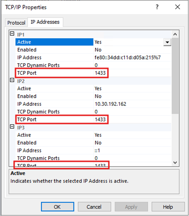 You can then configure custom ports on which SQL Express will listen for connections, as in this example (using the default port 1433):