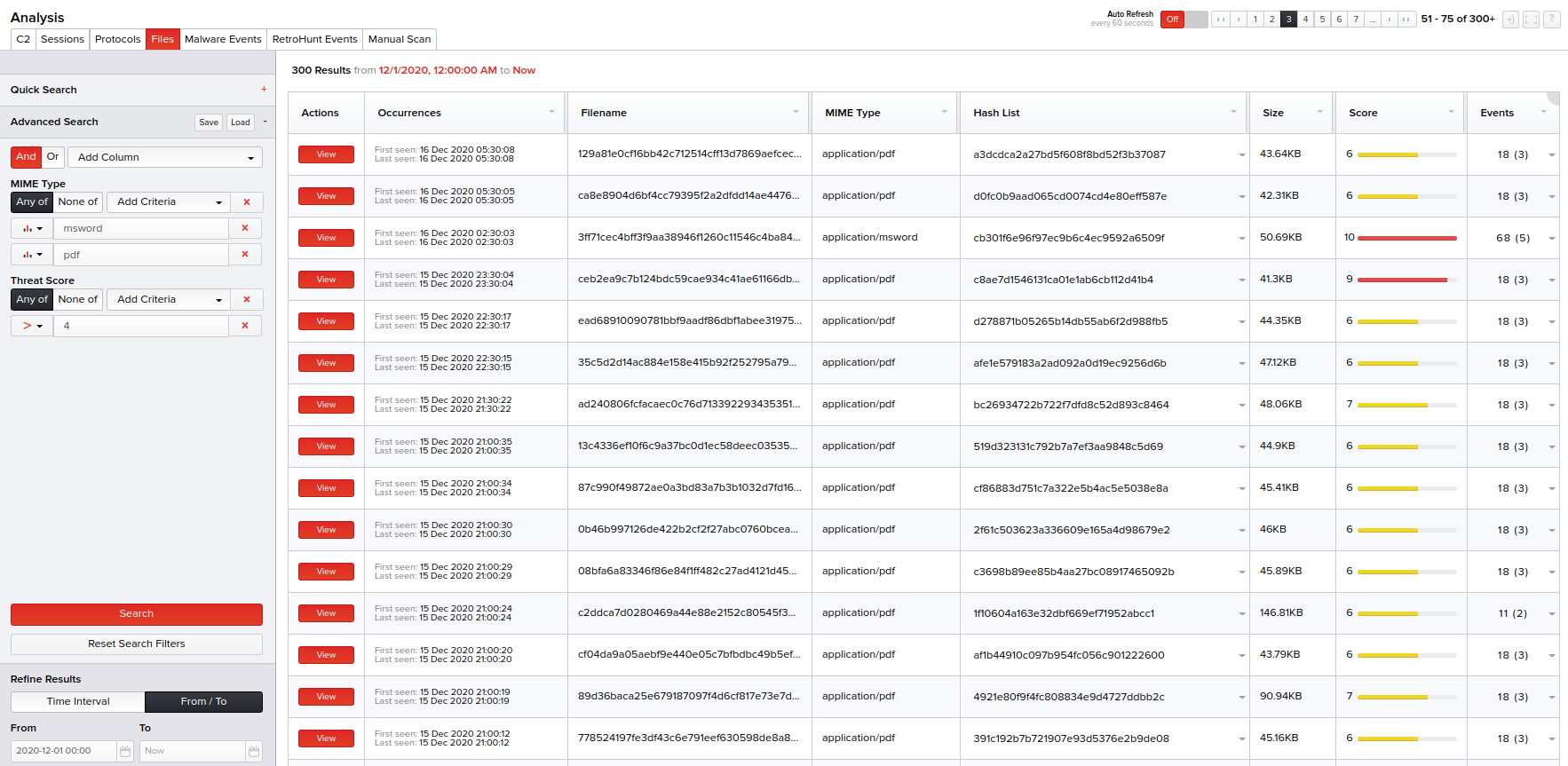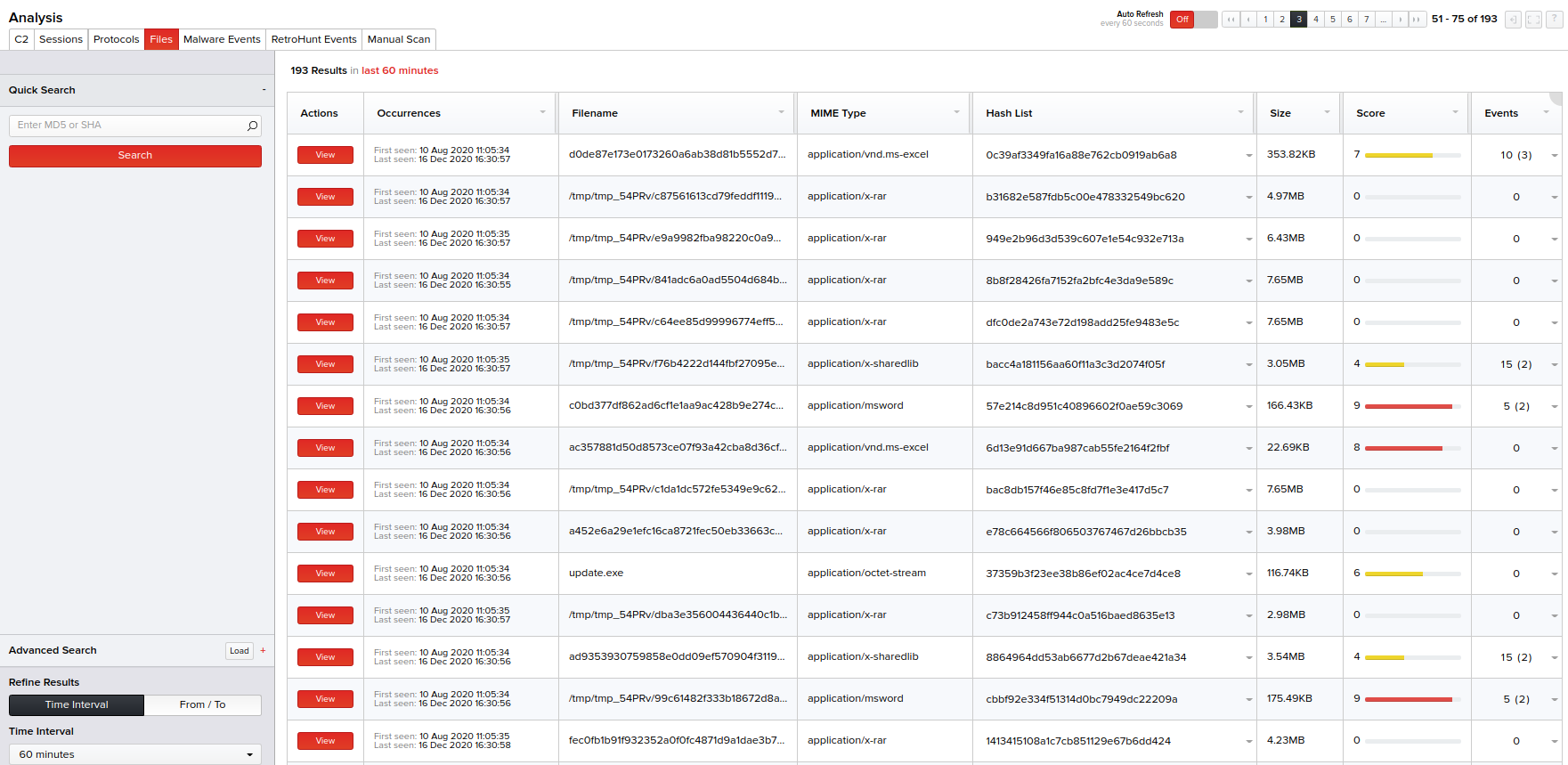 Basic details of each session displayed (for both the Quick Search or Advanced Search methods) include the first and last occurrences of the PCAPs, file names, MIME types, file hashes, MD5 hashes, SHA1, SHA256, SHA512, ssdeep fuzzy hashes, file size, and link to click and view further details of the files.
