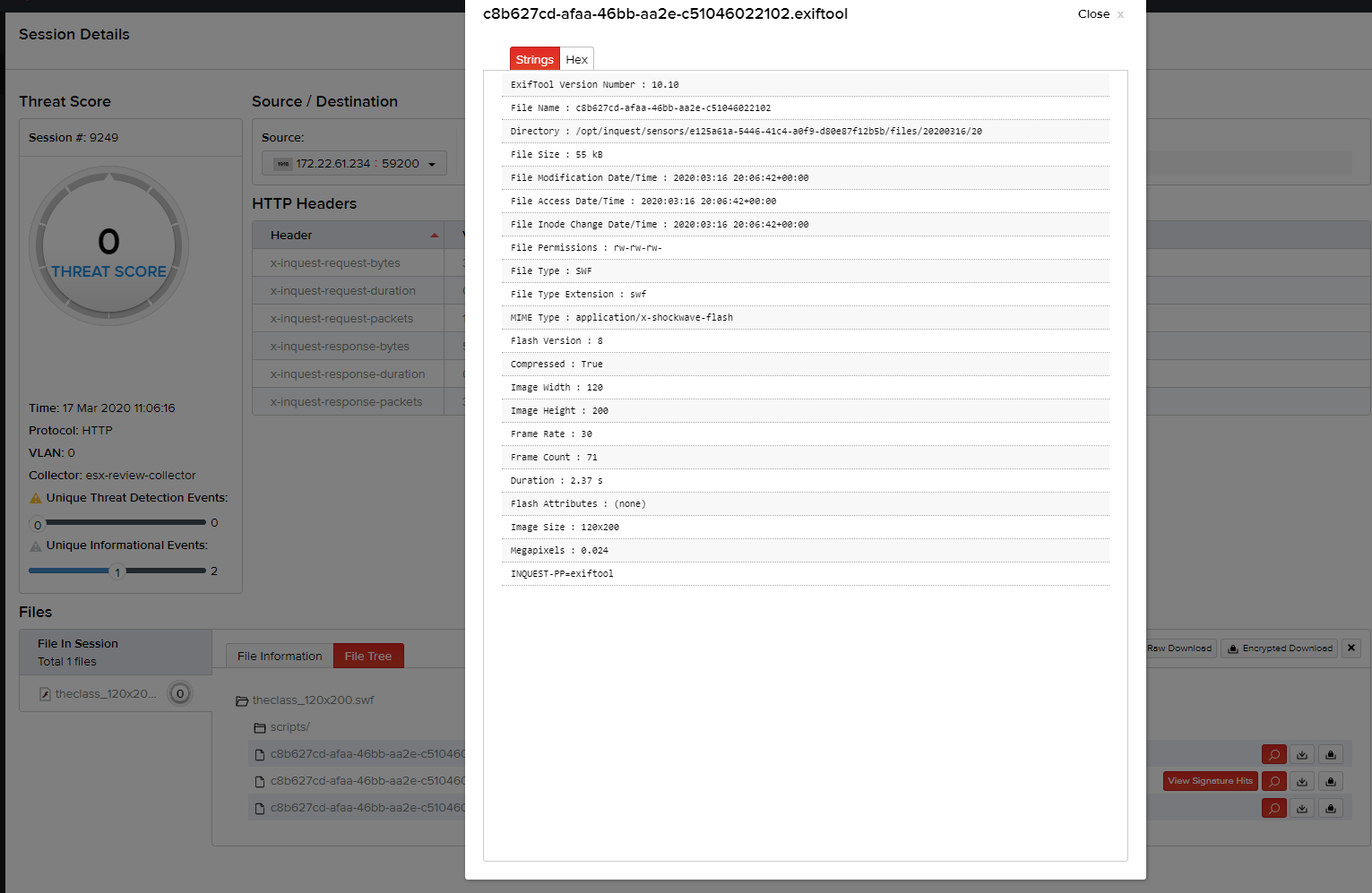 Click View in the Actions column corresponding to a file. The resulting page displays the transferred file information along with the option to view its content and download it as a raw or encrypted file. Encrypted file downloads are password protected using the password inquest. Details of TCP sessions containing the file can be viewed under the File Info section where you can view the fie name, MIME type, instance of the first and last occurrences of the file, file size, and entropy.