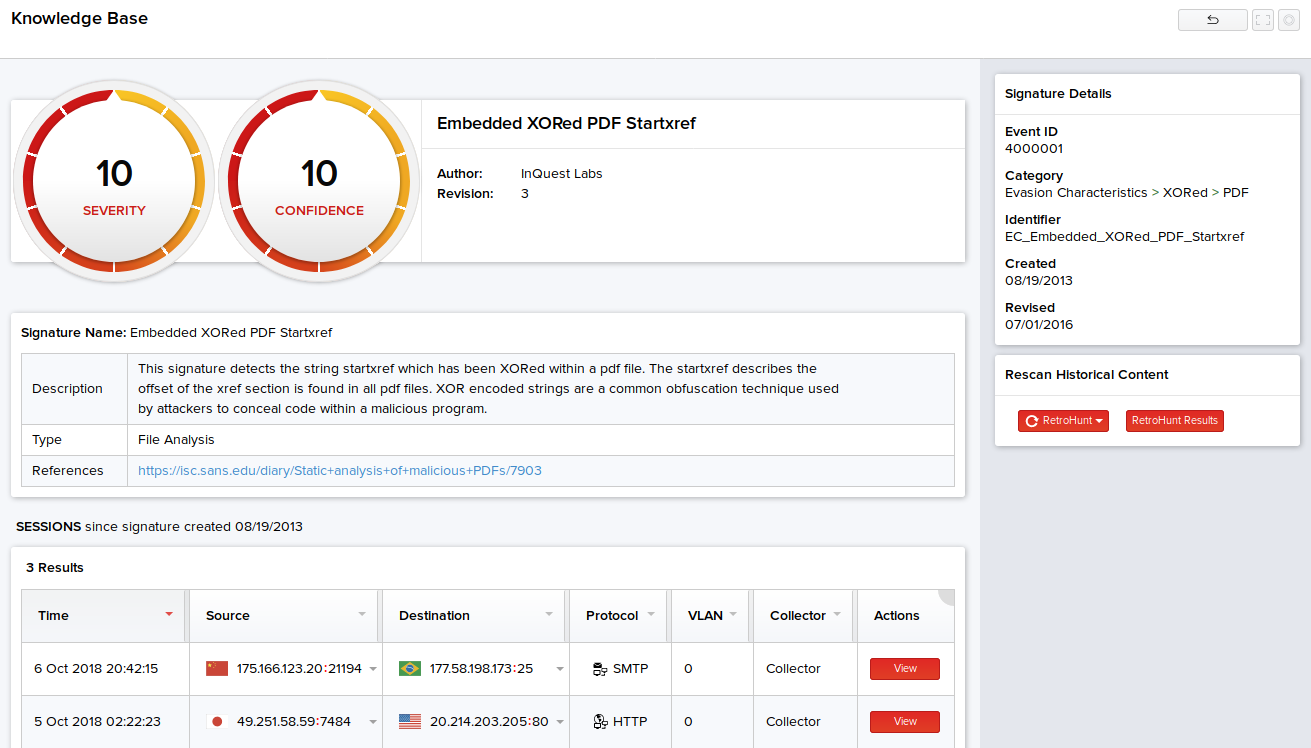 Manual RetroHunt scans can also be run from the Knowledge Base Details page by clicking RetroHunt under the Rescan RetroHunt Events section on the right side of the page.