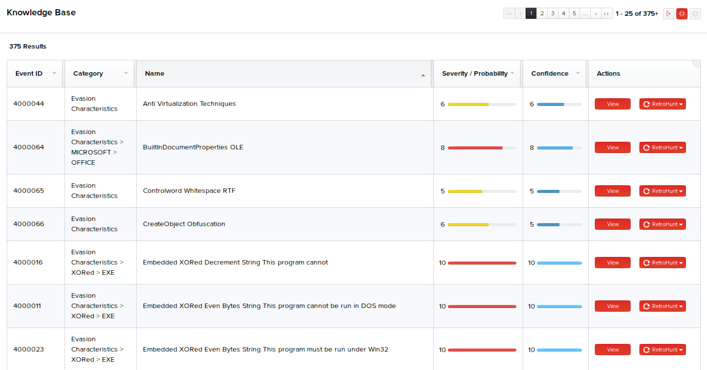 Basic details about the MetaDefender NDR signatures can be accessed by clicking Knowledge Base. The signature names, event id, category, confidence, and severity of each signature are listed. You can use page navigation to scroll across the Knowledge Base pages.