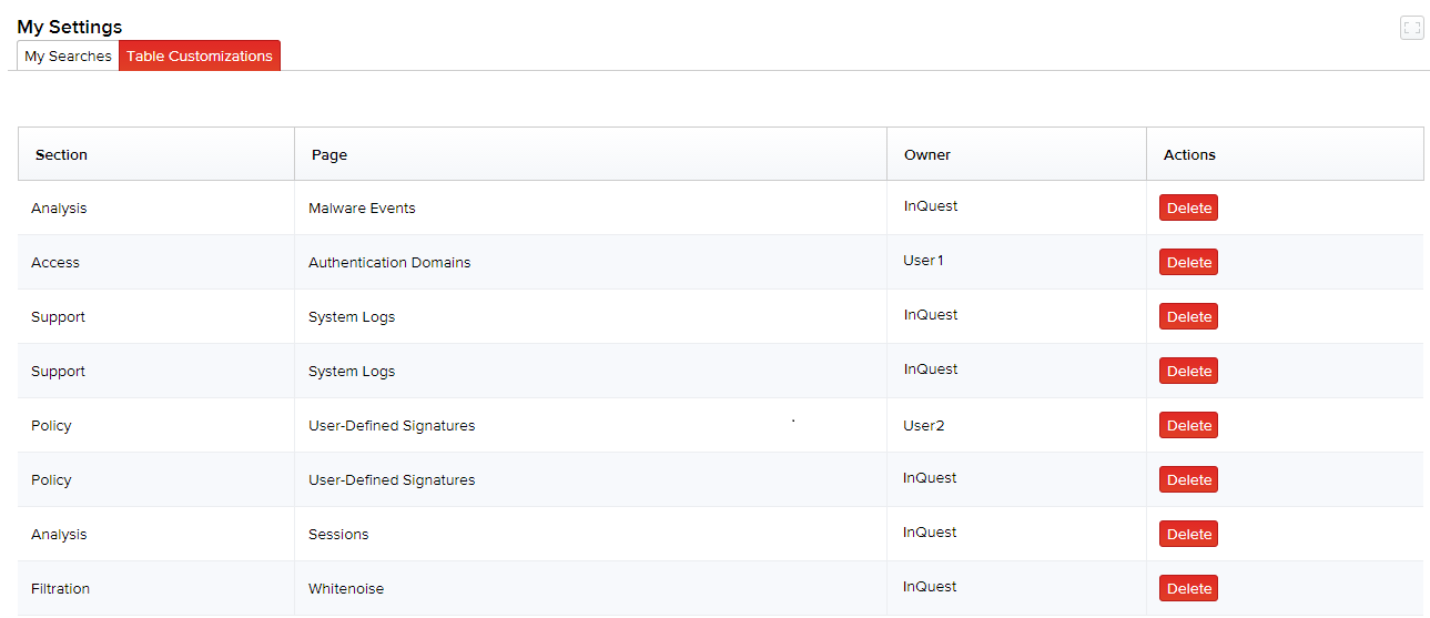- In the My Settings page, click Table Customizations. A list of sections and pages where you customized the display of the tabular columns appears.