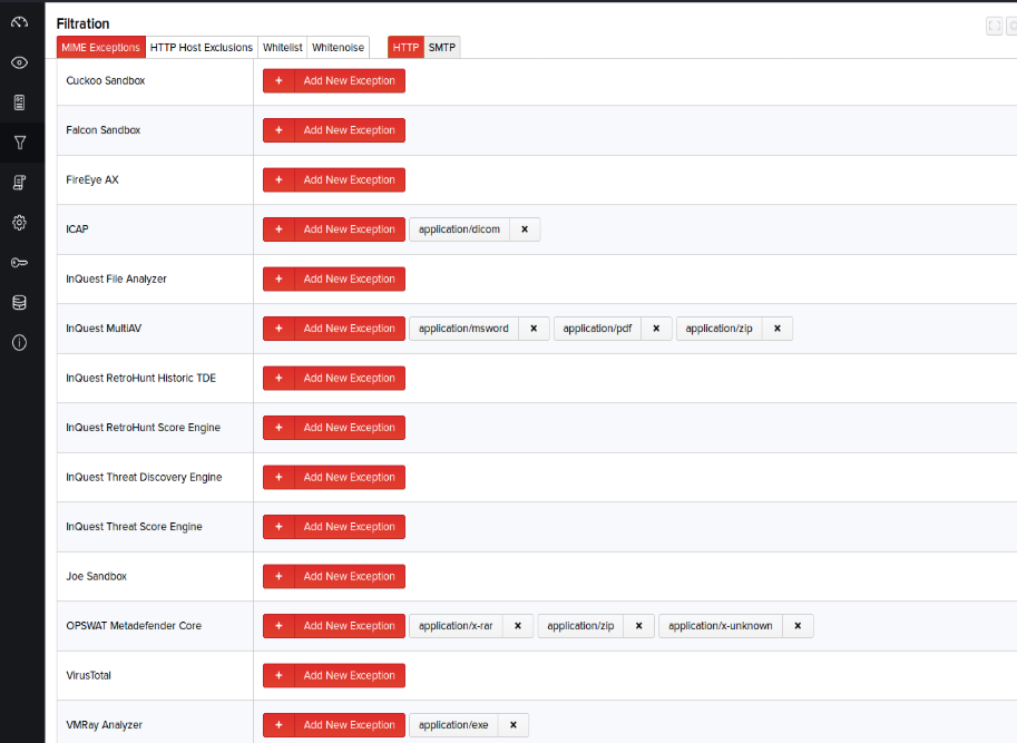 Filtering MIME types and protocols should only be done when processing queues seen on the Dashboard constantly show a backlog of files waiting to be scanned by one of the suppliers. As the number of files waiting to be scanned increases for a particular active integration feature, the time between receiving of files and the generation of alerts might increase as well. In such cases, it is appropriate to add MIME exceptions to reduce the timeframe and ensure alerts are generated within a reasonable timeframe.
