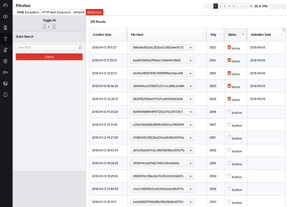 You can activate the default Inactive status of the MD5s by clicking their respective Status checkboxes. The status instantly changes to Active and displays the activation date. Once a file’s MD5 is actively whitelisted, future occurrences of receipt will no longer be recorded by the system.