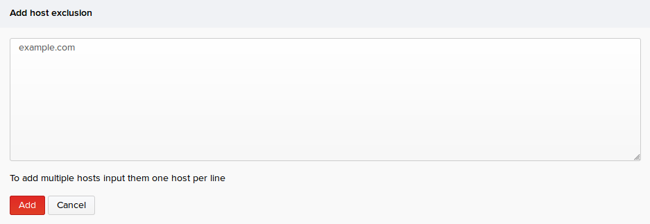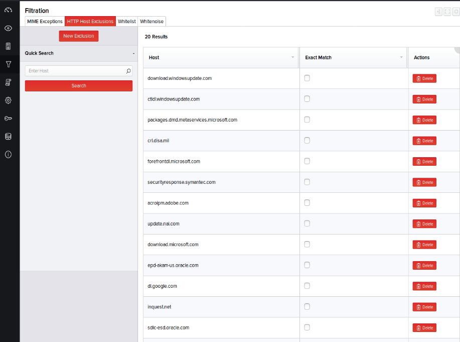 Note: You can type the partial or full hostname in the Quick Search text box on the left pane and click Search to locate the existing HTTP Host Exclusions. To remove a host from the exclusion list, click the Delete button of the corresponding host and then click Delete again to confirm its removal.