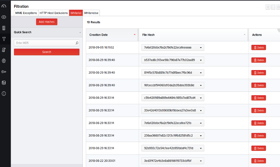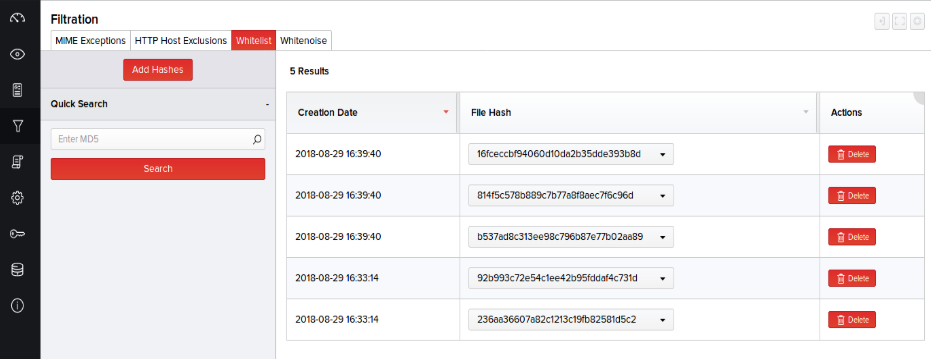 Note: You can search for an MD5 by typing it in the Quick Search box in the left pane. To remove an MD5, click the delete button of the corresponding MD5 and then click Delete again to confirm its removal.