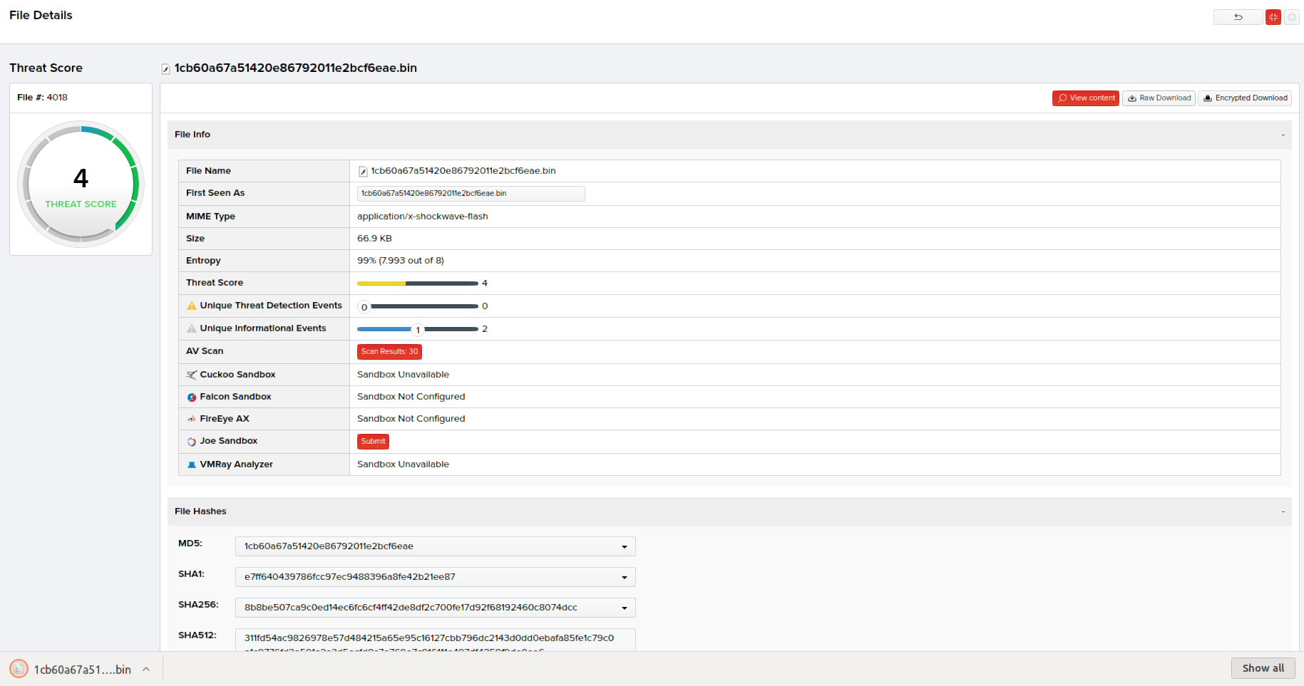 One of the most important aspects of the system is the availability of files to analysts and handlers. You can download files with original, raw content or as encrypted zip files. If the end-user is working on a Windows system running Antivirus software, downloading the encrypted file eliminates the risk of infecting their system and triggering unnecessary alerts while retrieving potentially malicious files. If encrypted, the original file will need to be extracted/unzipped with the password inquest.
