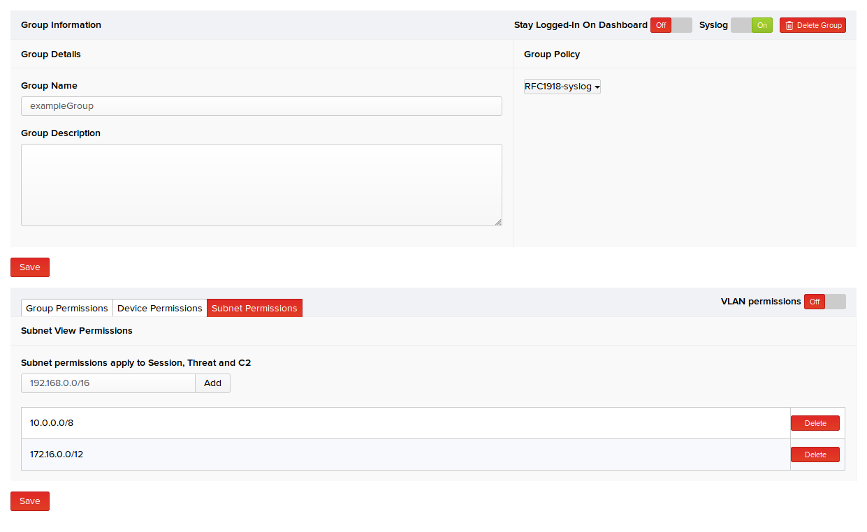 User groups are only permitted to view session data which fall within the subnets to which they have been assigned. In order to prevent a user group being able to see sessions that they are not authorized to view, subnet permissions must be granted explicitly. Subnet Permissions are required to define a group's command and control (C2) event visibility. Empty values for subnet view permissions will result in users within that group being unable to see any sessions data. User groups should be assigned at least a single VLAN or subnet group. To grant a user group full subnet view permissions, add 0.0.0.0/0 to that user group on subnet view permissions tab.