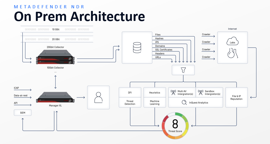 All updates, configuration, and tuning are accomplished through the Manager. Users interface with MetaDefender NDR through our on-premise web-based User Interface (UI), our powerful and open RESTful API, or via SIEM integration. Furthermore, there are integrations available within your existing security infrastructure for a variety of antivirus and sandbox technologies that serve in a complementary capacity to MetaDefender NDR's analysis process.