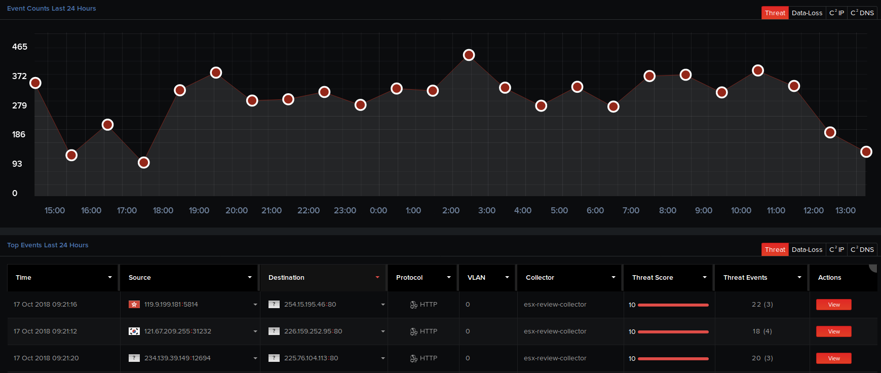 Furthermore, you can view the basic details of the top 10 events detected in the last 24 hours in a tabular form. On the Threat tab, click View corresponding to a threat to view its detailed analysis report on the Analysis page. On the C2 IP and C2 DNS tabs, click View to view detailed reports on the IP connections and DNS lookups respectively.