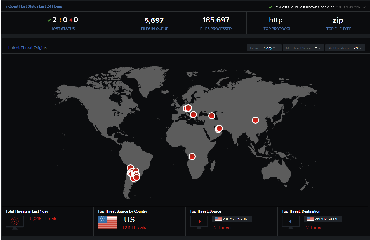 The World map displays red nodes representing the source IP locations of the latest threats. For a selected timeframe, threat score, and the number of locations specified in the drop-down menu, you can view the total number of threats, country listed as the top threat source, source and destination IP addresses of the top threats and their respective number of threats. Tip: Hover over a node to view a tooltip text of the format AU: HTTP / SMTP : 5 / 0. It indicates AU is the country code for Australia and 5 threats are originating from or targeting Australia via the HTTP protocol.