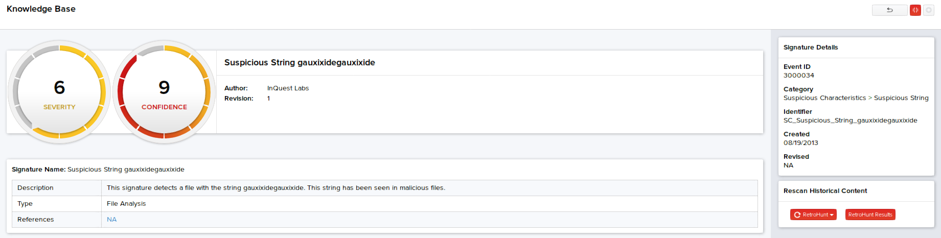 Information about MetaDefender NDR signatures can be accessed by clicking Knowledge Base. The signature names, event id, category, confidence, and severity of each signature are listed. To search for specific information contained in rules, such as metadata, enter the Quick Search text on the left pane, and click Search. Results matching your search, including the text inside the signature details are displayed.