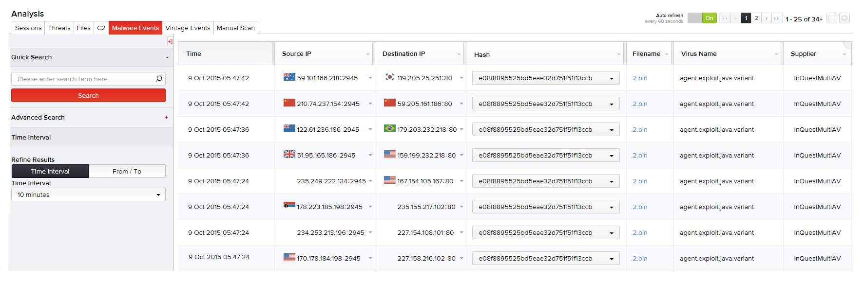 Select the column(s) and specify their criteria. You can also specify the session time from the Time Interval drop-down menu or select a date range from the built-in calendars by clicking the From/To option. Click Search. Results appear on the right pane displaying the instance of the files triggered, source IP, destination IP, MD5, filename, virus name and the supplier.