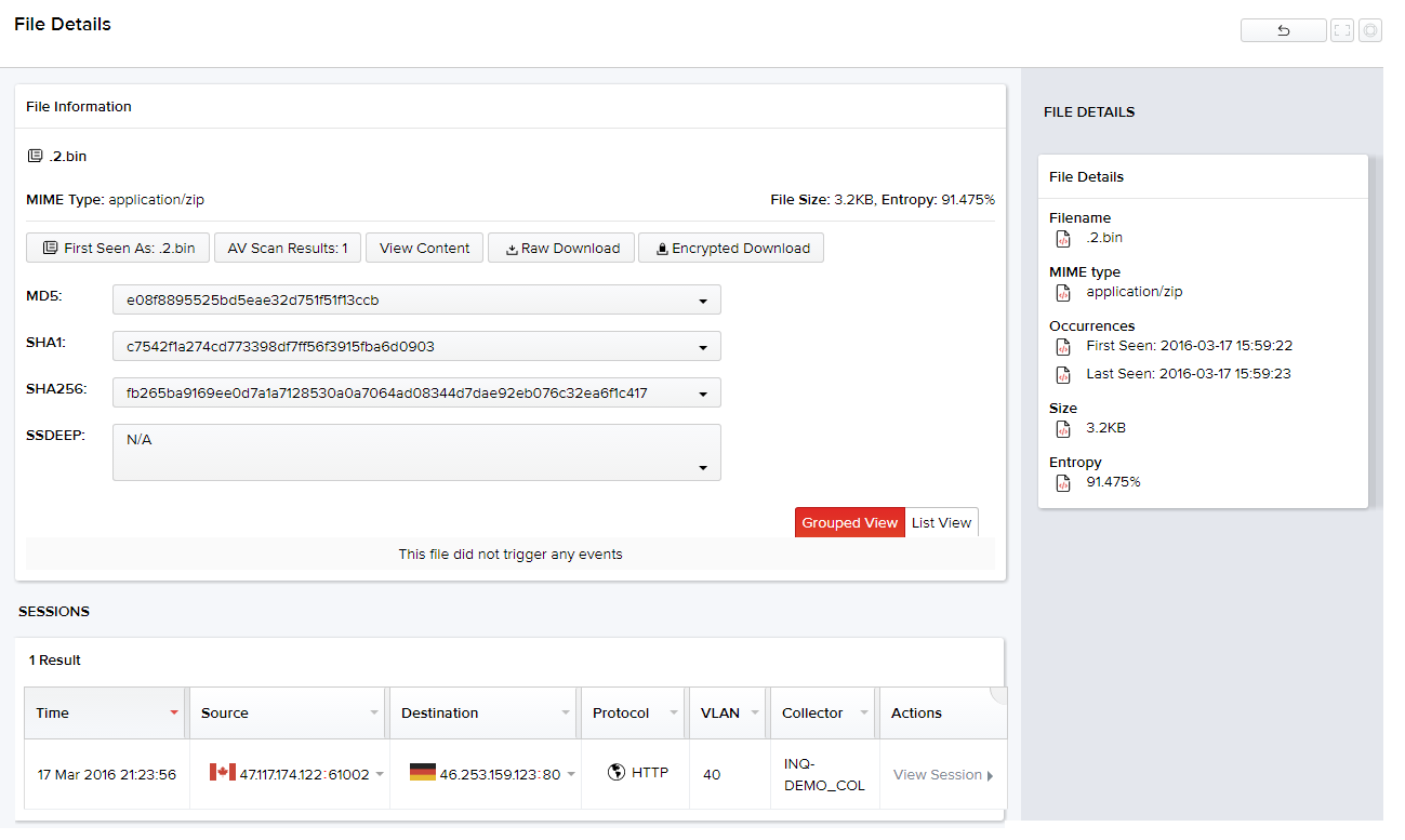 Click the file name link to view its details. The resulting page displays the transferred file information along with the option to view their content and download them as raw or encrypted file(s). Details of a TCP sessions containing the file can be viewed in a tabular form.