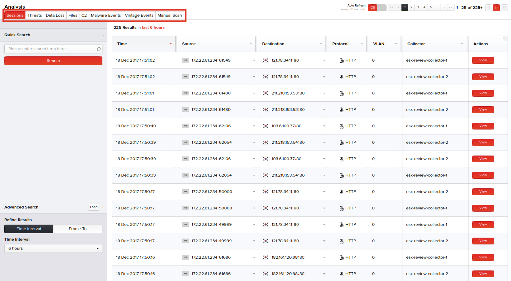 The Sessions page allows you to view attributes associated with the TCP sessions recorded by MetaDefender NDR . To begin viewing the TCP sessions, click Analysis. The default Sessions page displays the basic session details in a tabular form. The interface provides both Quick Search and Advanced Search features on the left pane.