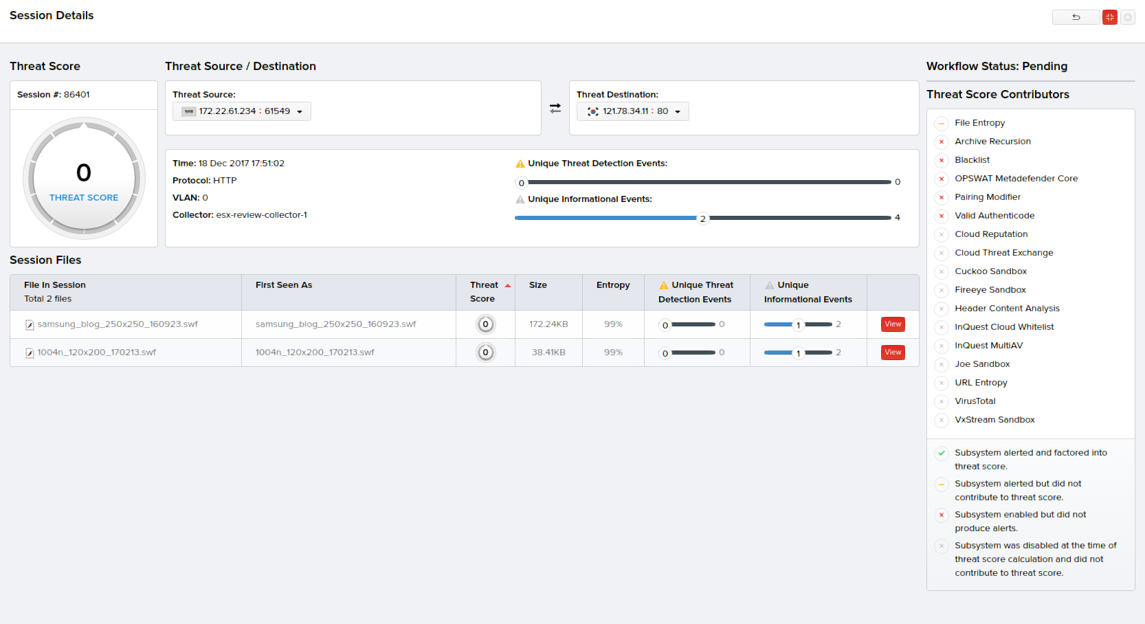 On the right pane of this page, you can view the collector host name and information on the number of session events. Click the Threat Score Contributors panel to view details on the threat score contributors on the top section of this page.