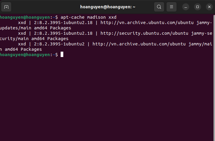 apt-cache madison <package_name>Example (xxd package):