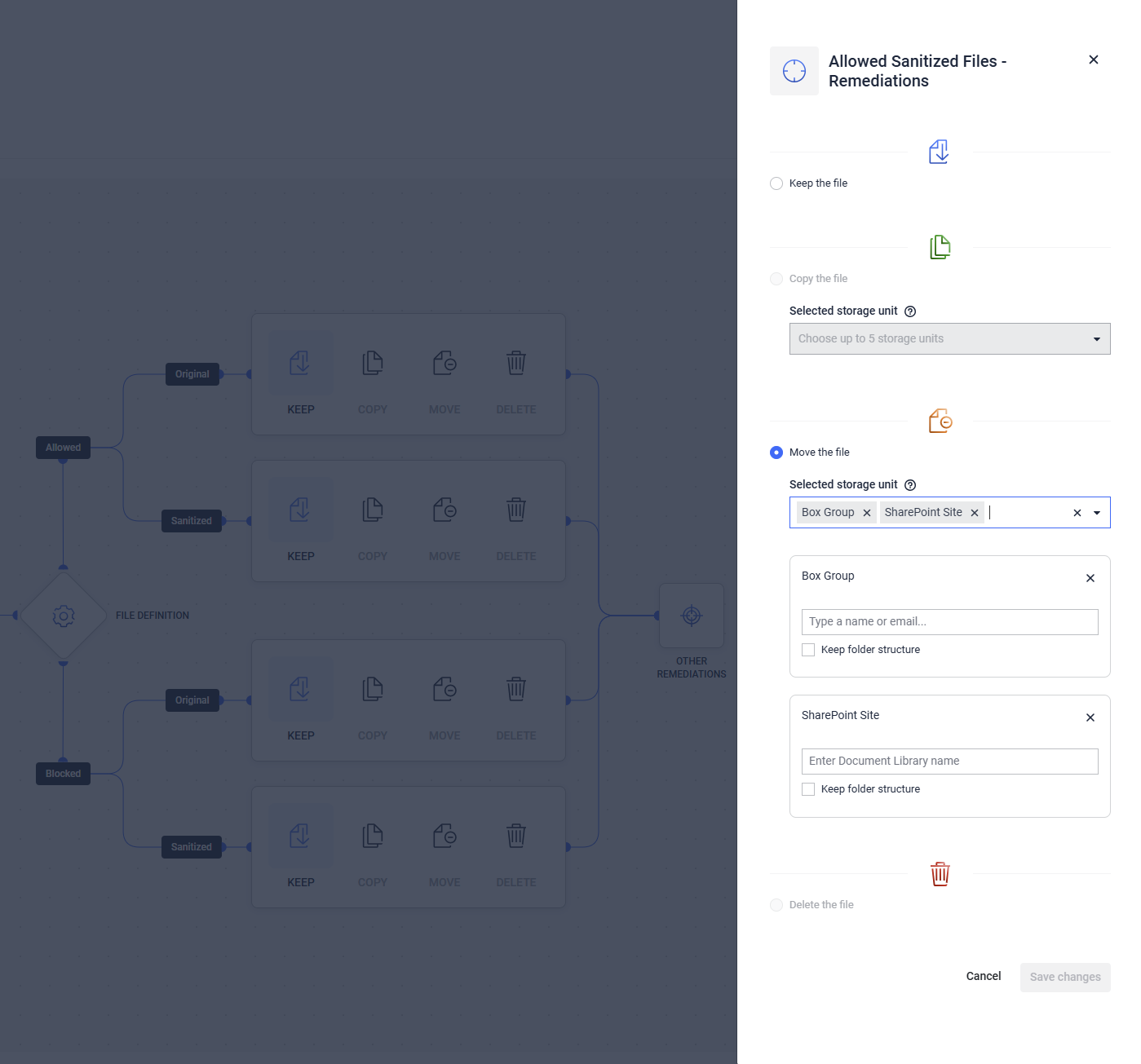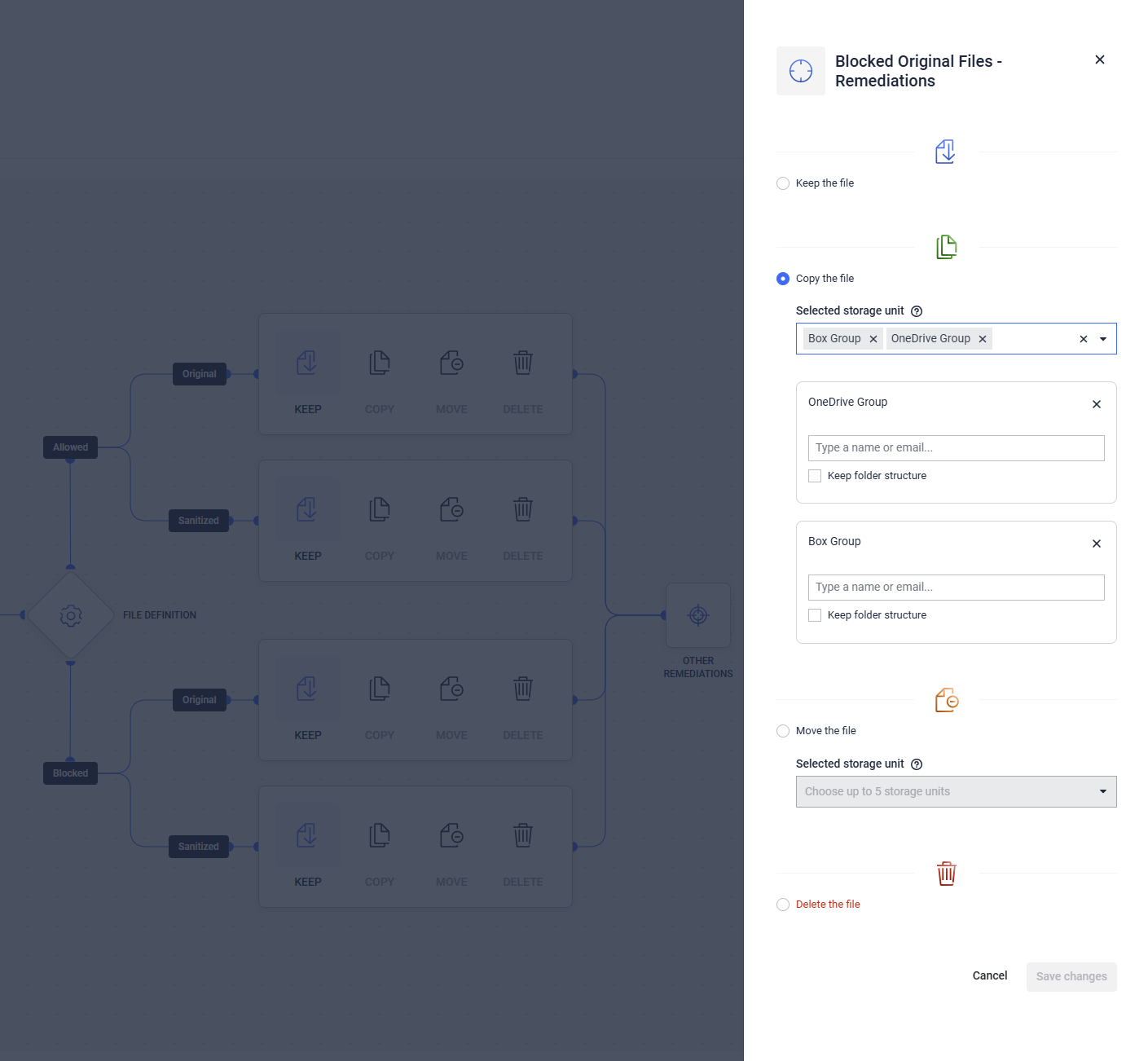 Files marked as allowed during processing can be deleted, copied or moved to one or more storage units (up to a maximum of 5 destinations per remediation type).