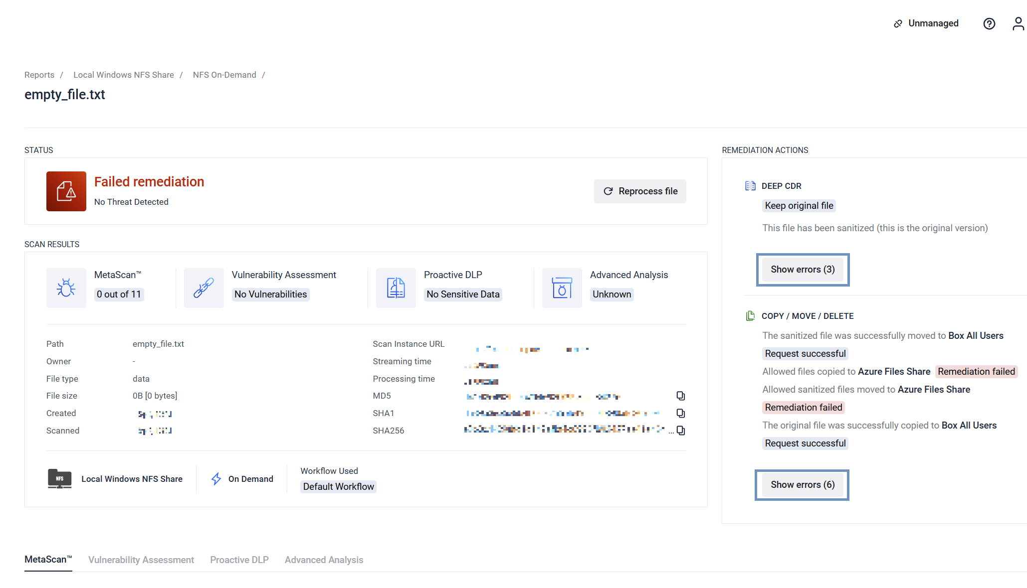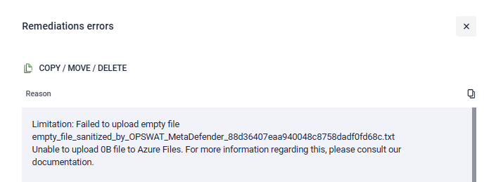 To obtain further details about this issue, users can filter the files marked as Remediation Failed and click on individual files to access their specific reports.