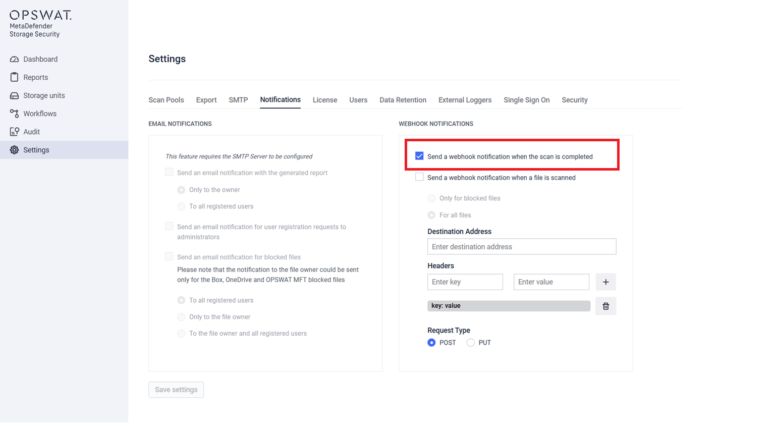 - Go to Settings > Notifications in the MetaDefender Storage Security console.