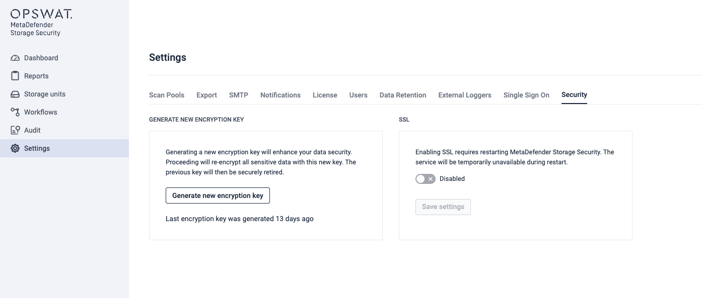 To enhance your system's security, you can generate a new master encryption key. This action will re-encrypt all sensitive data—such as storage credentials, API keys, and others—and securely retire the previous key.