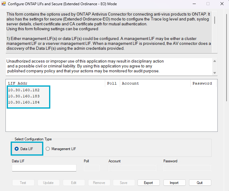 - From MDSS machine, open the Configure ONTAP LIFs app provided by NetApp and available with the ONTAP AV Connector installation.