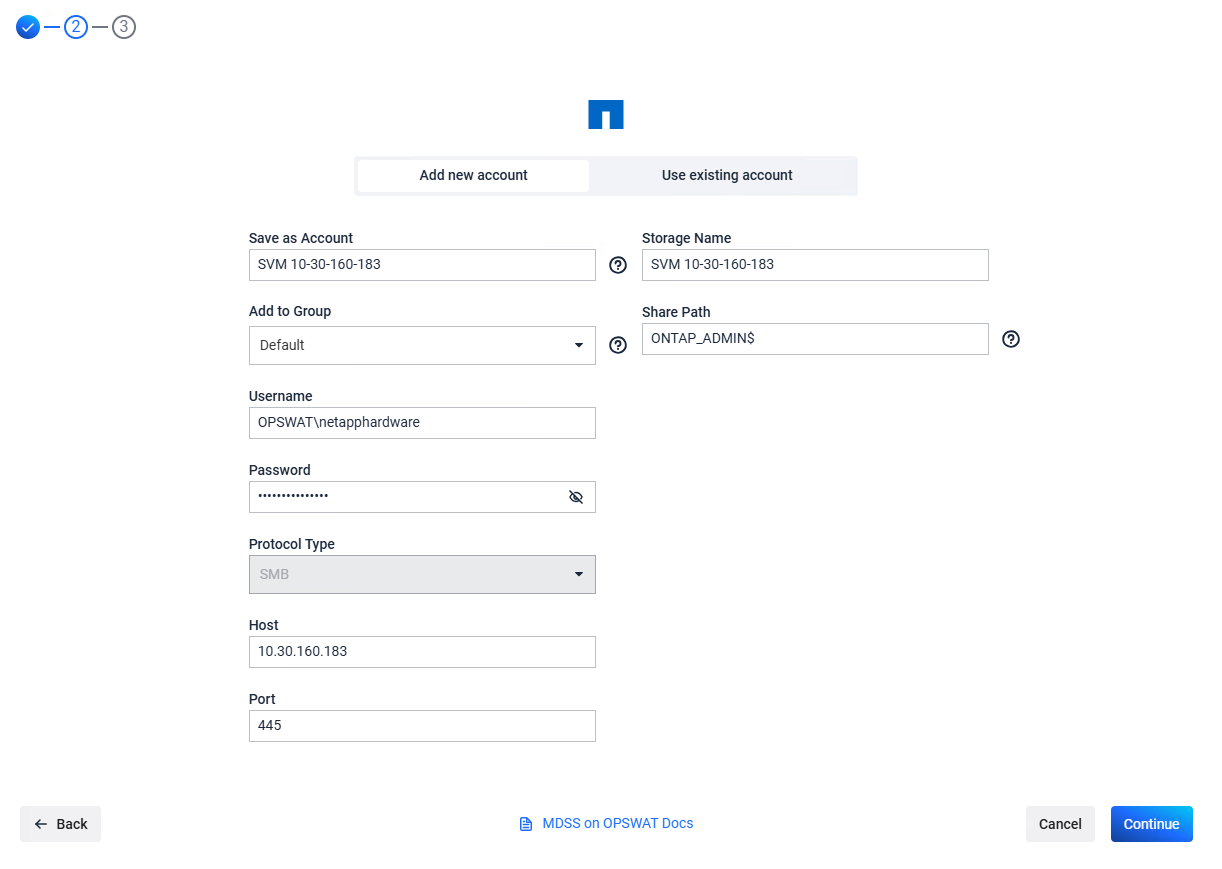 - Share Path. In case you want to add all the SMB shares created under the SVM, input ONTAP_ADMIN$ (privileged path created by ONTAP) that is available only for the privileged user.