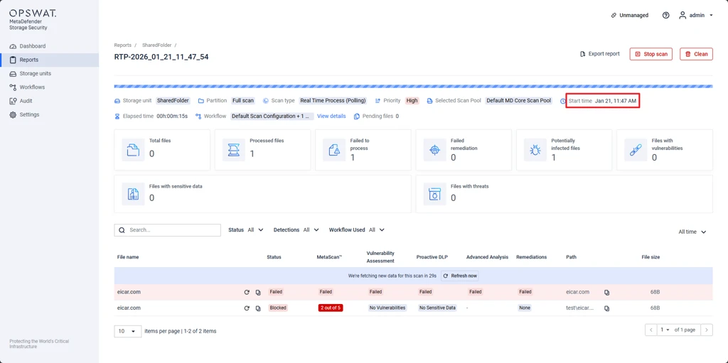 Issue: MetaDefender Storage Security resets the Real-Time Processing (RTP) Start Time every day.