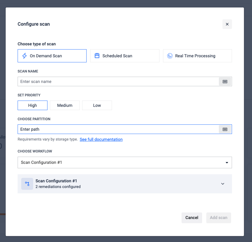 - Start the Scan: Click "Add Scan" to begin processing all files in your storage integration immediately.