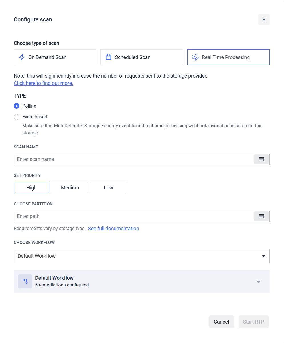 - Choose partition (optional): Choose a partition of the storage to scan (eg. a sub-folder). Only one single Real-Time Processing scan is allowed per partition.