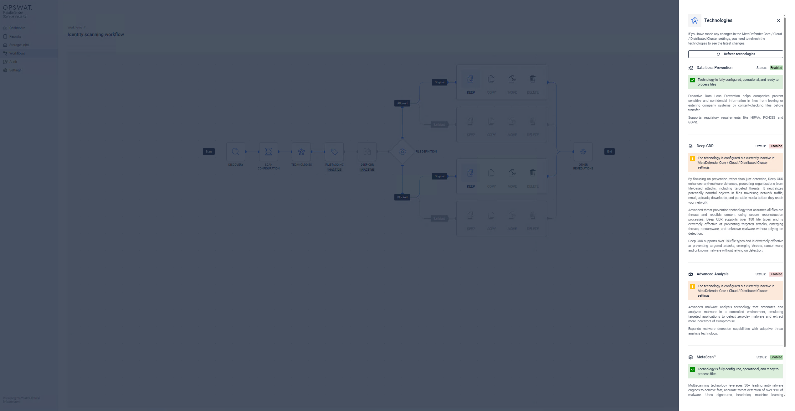 This lists all the available technologies that are available in the MetaDefender Cloud/Core instance that was set previously in the Scan Configuration.