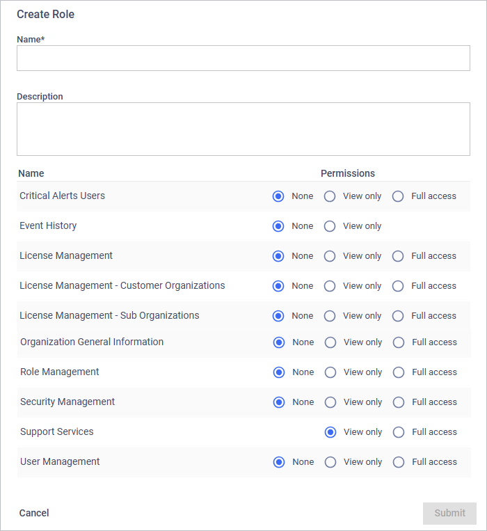 Authorized users can create, modify, or delete roles with permissions tailored to their organization's needs. Roles can be assigned "None", "View Only" or "Full Access" permissions across various functional areas, referred to as Role Objects.