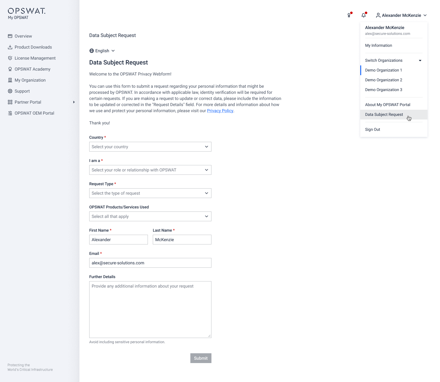 - Correct My Data: Request corrections to your personal data held by OPSWAT.