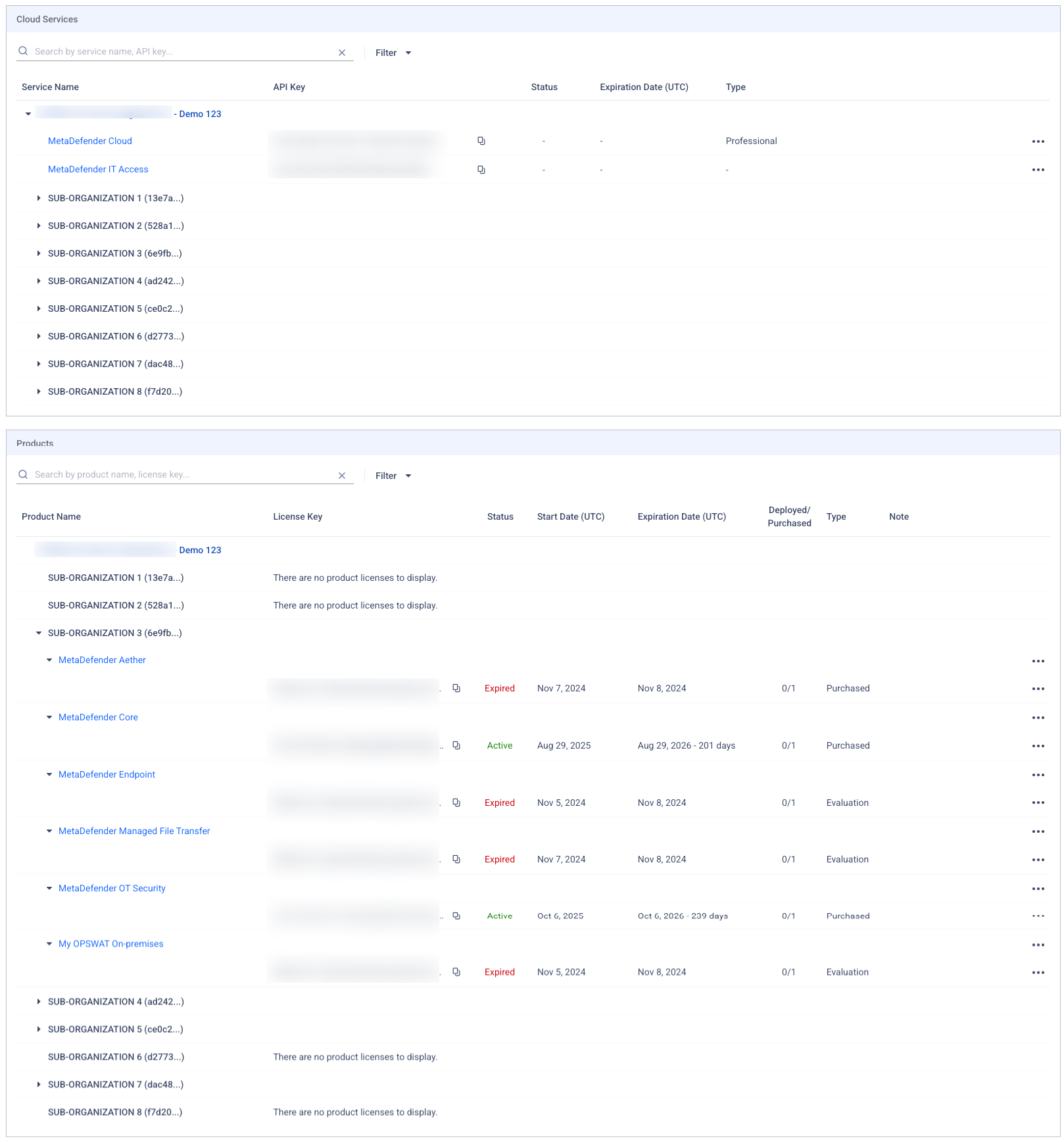This section outlines how to view and manage licenses for both your main organization and its sub-organizations within My OPSWAT Portal.