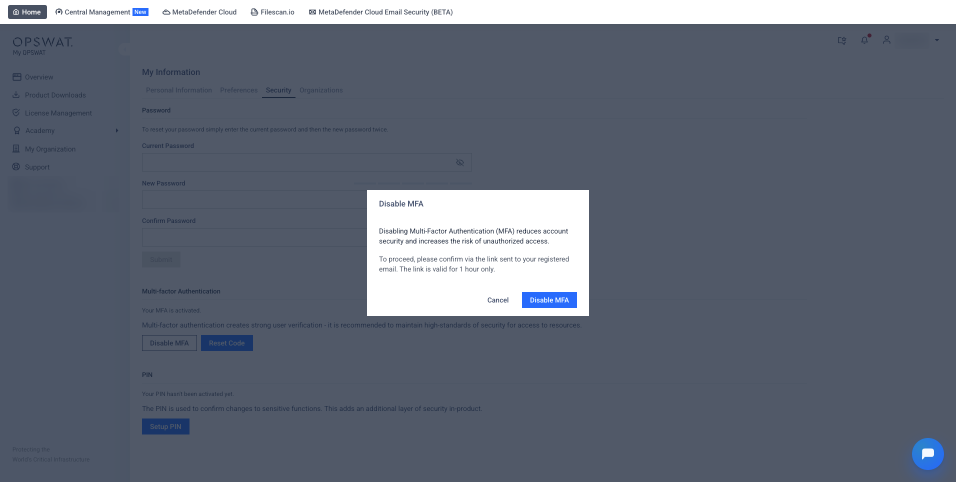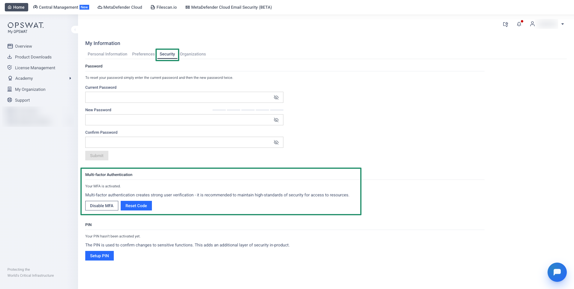 The Security tab in the My OPSWAT Portal allows you to manage your account's security settings, including updating your password, setting up Multi-Factor Authentication (MFA), and configuring a PIN for sensitive actions.
