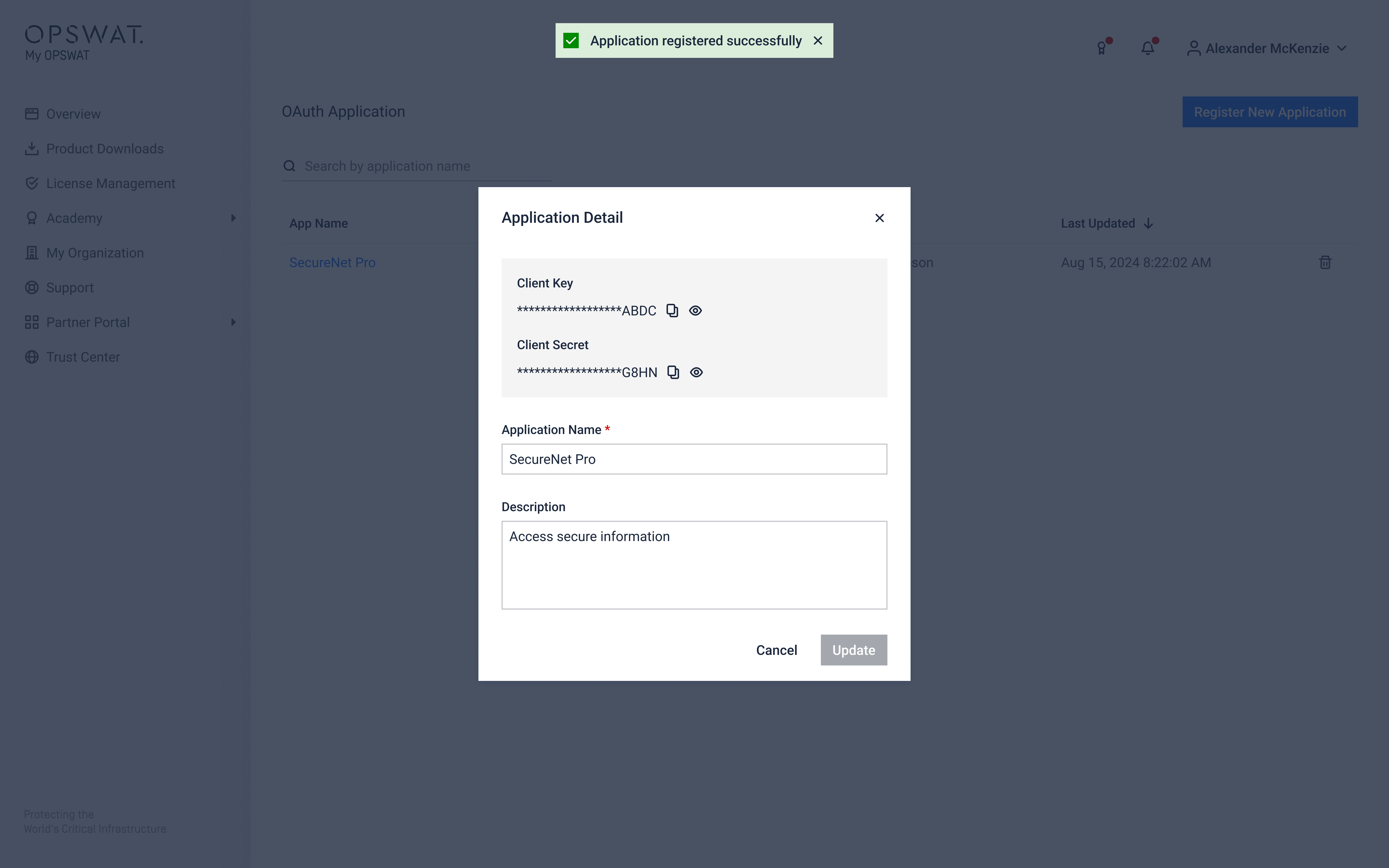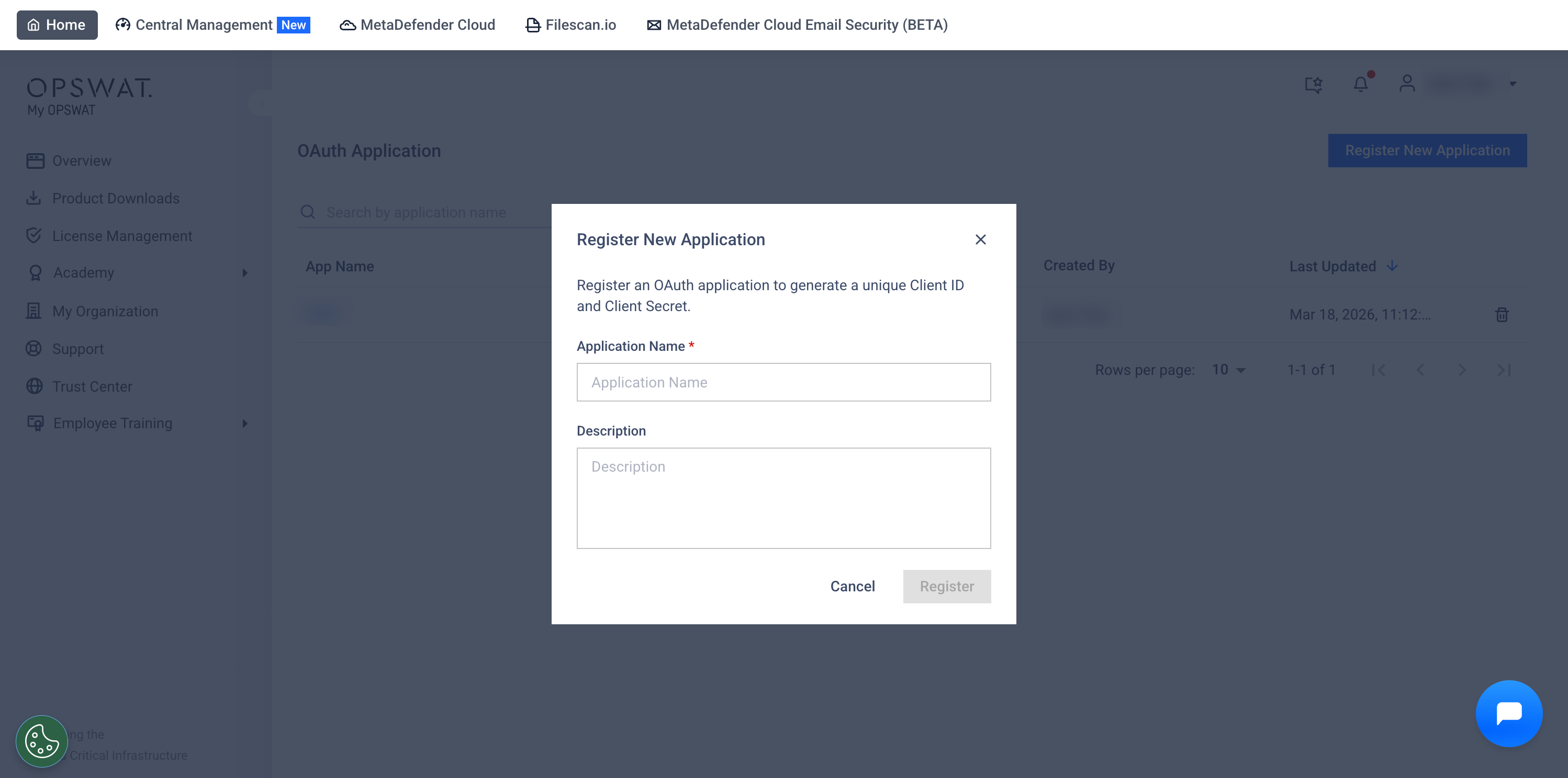 OAuth Application allows you to create and manage OAuth applications in My OPSWAT Portal. You use these applications to generate Client Credentials (Client Key and Client Secret) and authenticate your server-to-server integrations with the Portal.