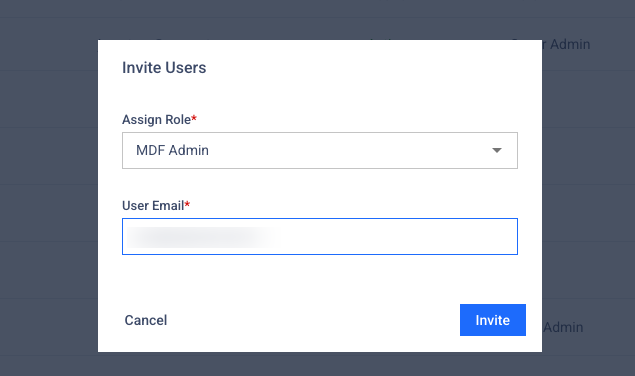 - Enter the email addresses of the users you want to invite and select Role from the dropdown list. For details on roles and permissions, see Roles & Permissions