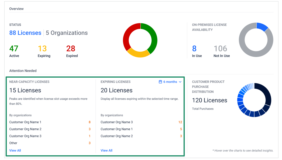 The number of near-capacity and expiring licenses for each organization is now presented in a list format instead of a bar chart. This change allows you to view the numbers directly without the need to hover, making it easier to access the information at a glance.