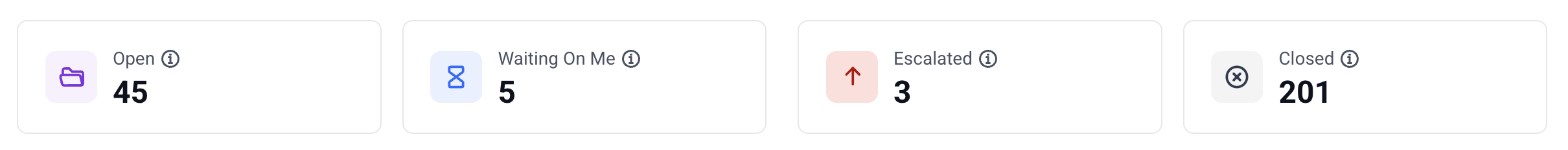 View case counts by status (Open, Waiting on Me, Escalated, Closed). Click any status to quickly filter and access related cases