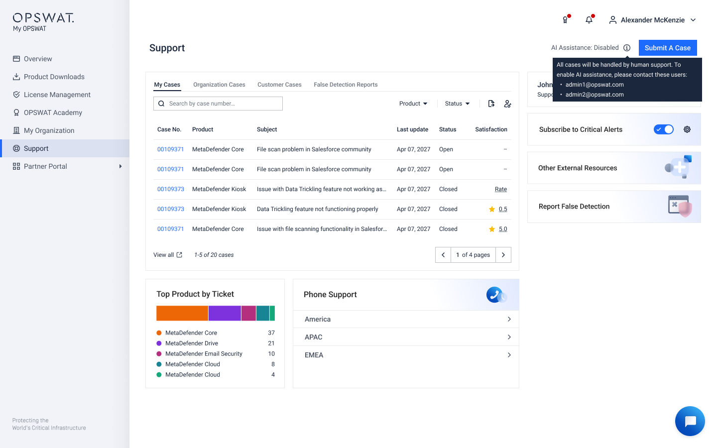 The Support Page is where users can efficiently find solutions to their issues. Whether through interacting with the AI Chatbot, submitting a case, or manage cases, this feature of My OPSWAT Portal is designed to streamline your support experience.