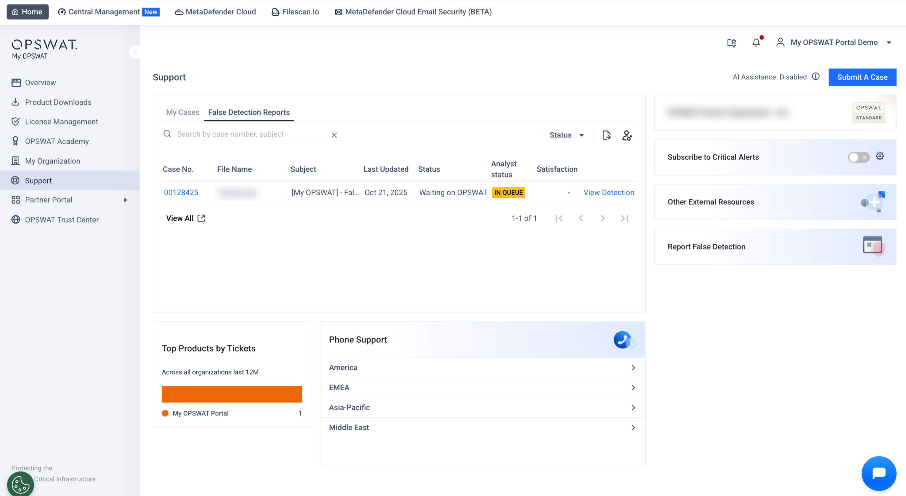 Once you submit a False Detection report, system will automatically generate a Support case showing in Support > False Detection Reports tab, allowing you to easily monitor the progress.