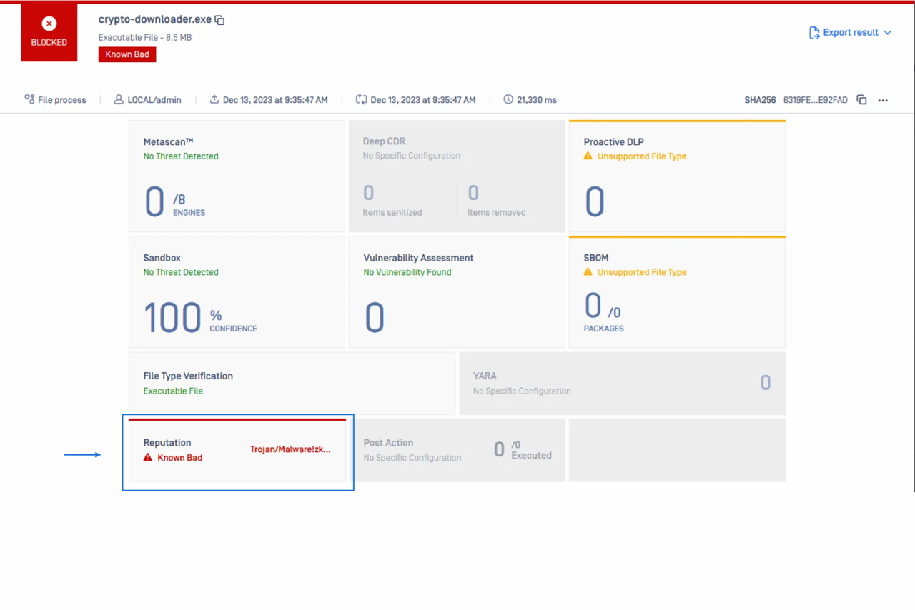 File Reputation: The reputation engine classifies files as known good, known bad, or unknown by comparing hashes against a database of trusted and malicious files.