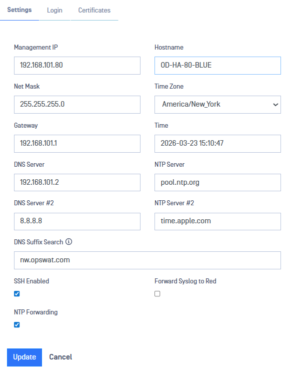 Setting the time manually will cause MetaDefender Security Gateway to reboot. This will happen in both servers BLUE and RED.